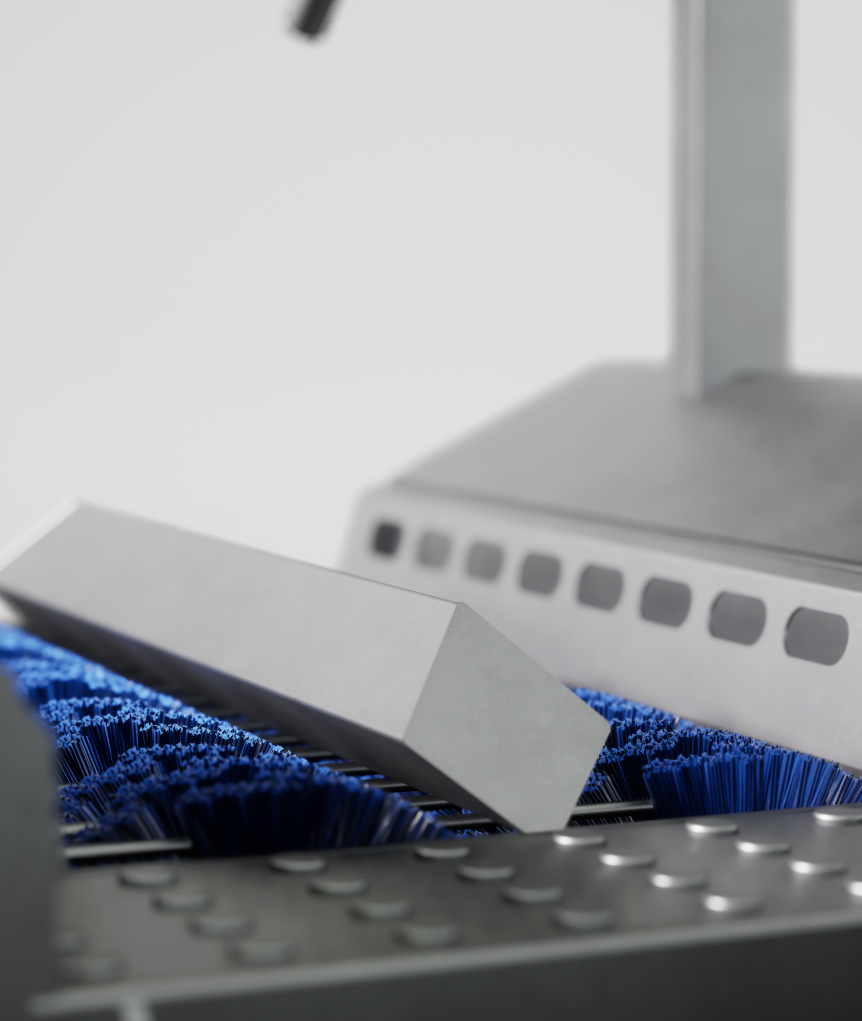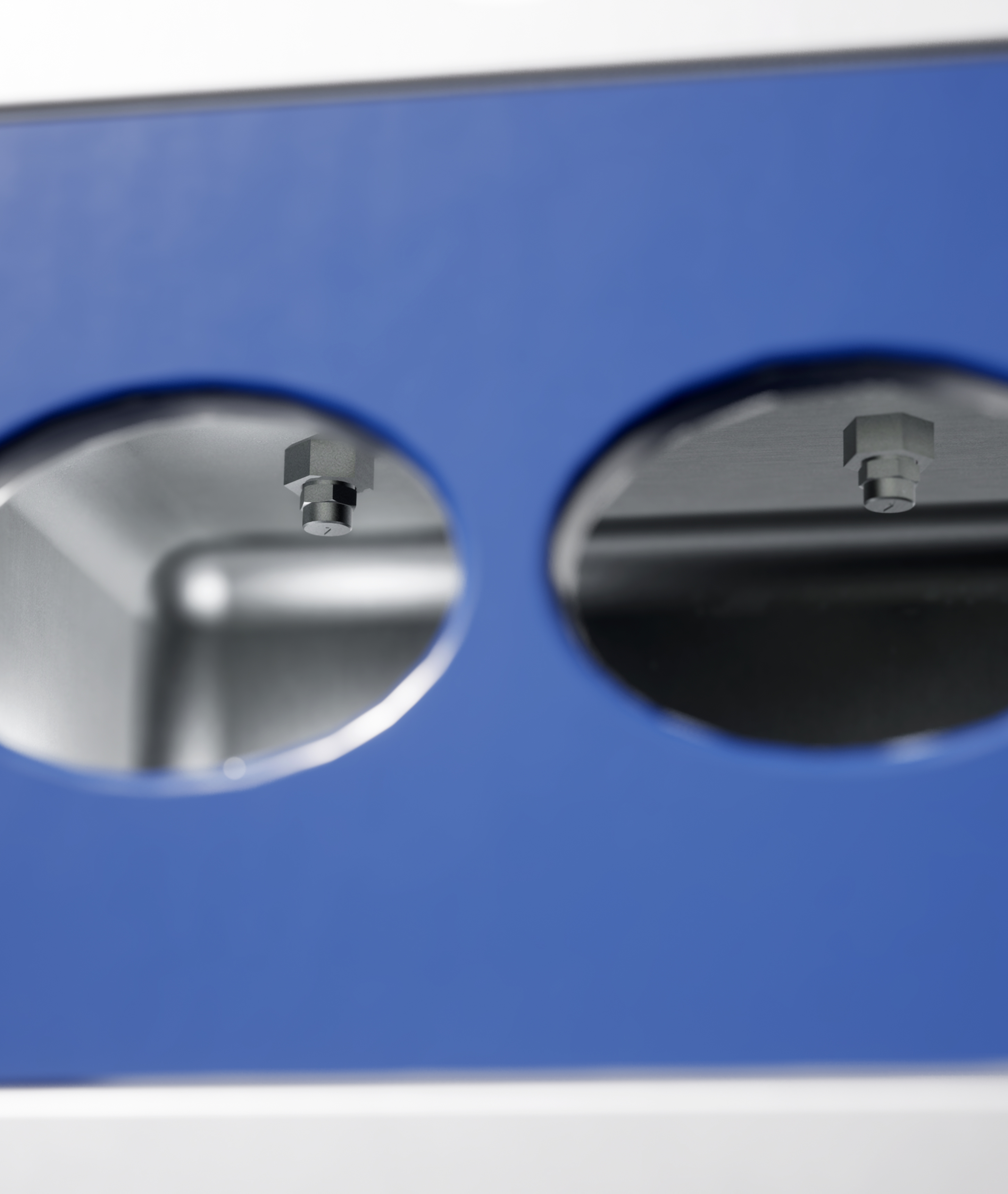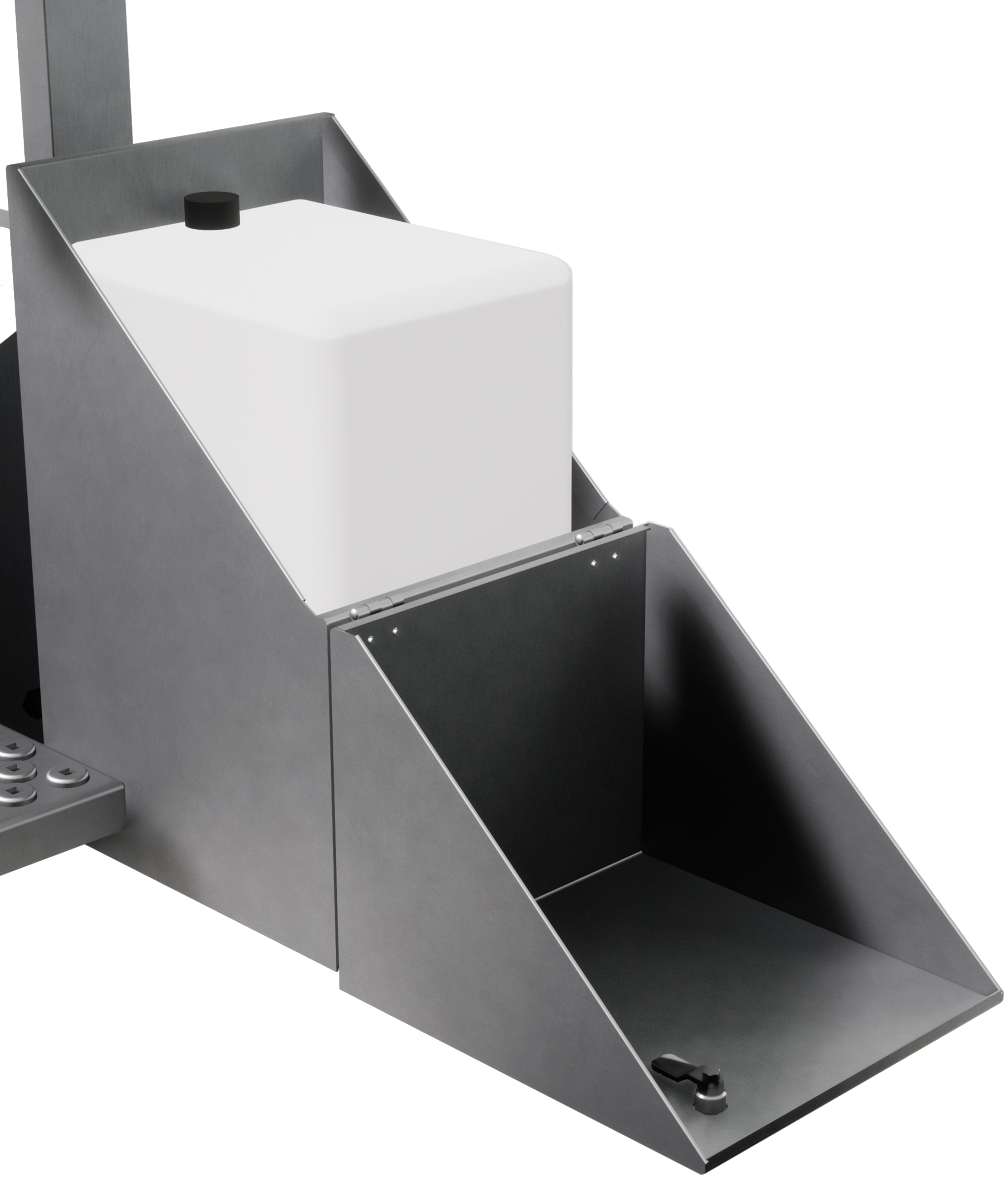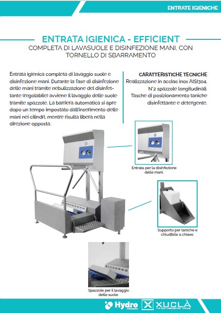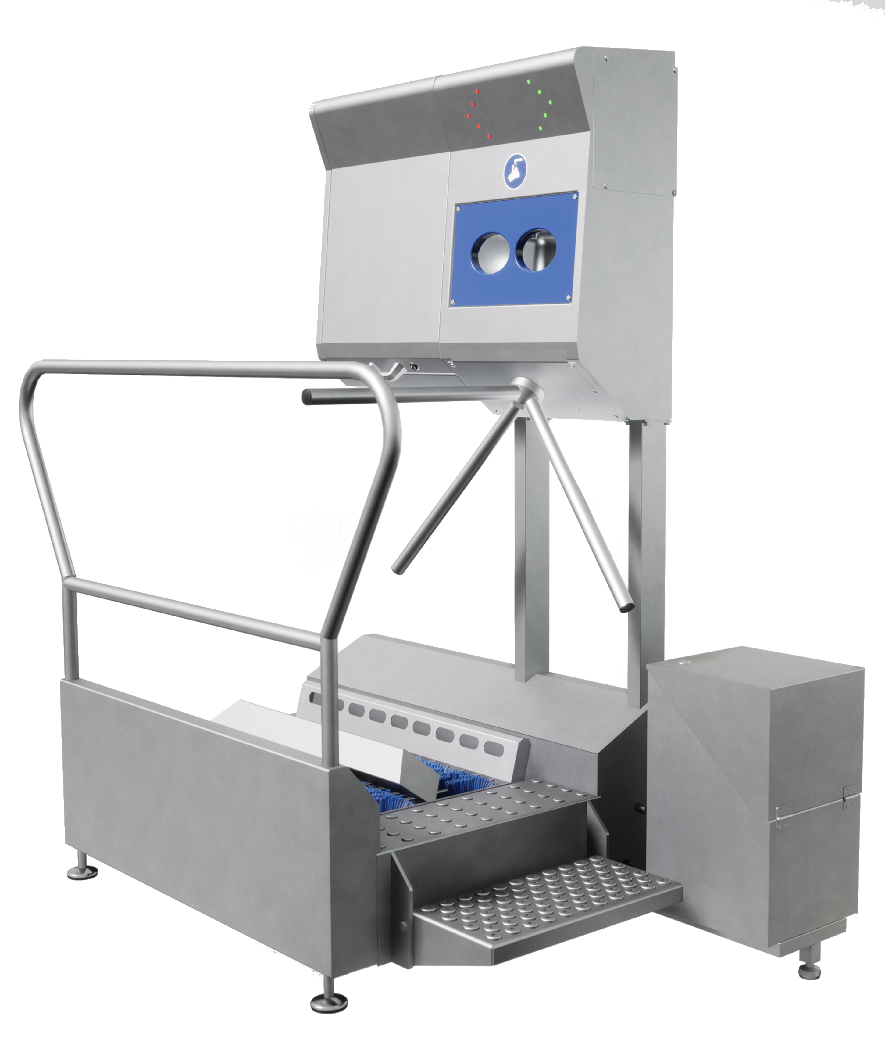 Entrata igienica completa di lavaggio suole e disinfezione mani. Durante la fase di disinfezione delle mani tramite nebulizzazione del disinfettante (regolabile) avviene il lavaggio delle suole tramite spazzole. La barriera automatica si apre dopo un tempo impostato dall’inserimento delle mani nei cilindri, mentre risulta libera nella