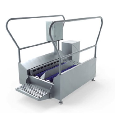 Entrata igienica con lavaggio suole, il processo prevede una fase di lavaggio delle suole tramite spazzole che vengono attivate da un rilevatore temporizzato. Dotato di ringhiere laterali.