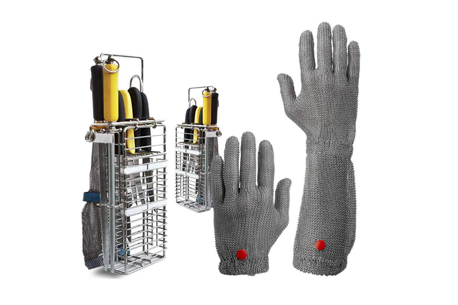 Unità di lavaggio per portacoltelli e guanti in maglia metallica. Il processo prevede una fase di lavaggio-sterilizzazione a caldo e una fase di risciacquo con acqua di rete. Estrazione dei vapori generati nel riscaldamento dell’acqua. Controllo elettronico della T° di lavaggio. Ogni ciclo viene registrato in un file informatico che ne consente la consultazione.