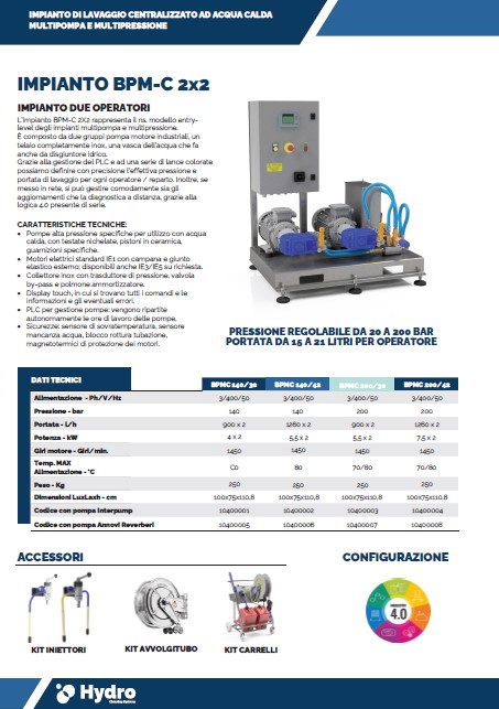 L’impianto BPM-C 2X2 rappresenta il ns. modello entrylevel degli impianti multipompa e multipressione. È composto da due gruppi pompa motore industriali, un telaio completamente inox, una vasca dell’acqua che fa anche da disgiuntore idrico. Grazie alla gestione del PLC e ad una serie di lance colorate possiamo definire con precisione l’effettiva pressione e portata di lavaggio per ogni operatore / reparto. Inoltre, se messo in rete, si può gestire comodamente sia gli aggiornamenti che la diagnostica a distanza, grazie alla logica 4.0 presente di serie.